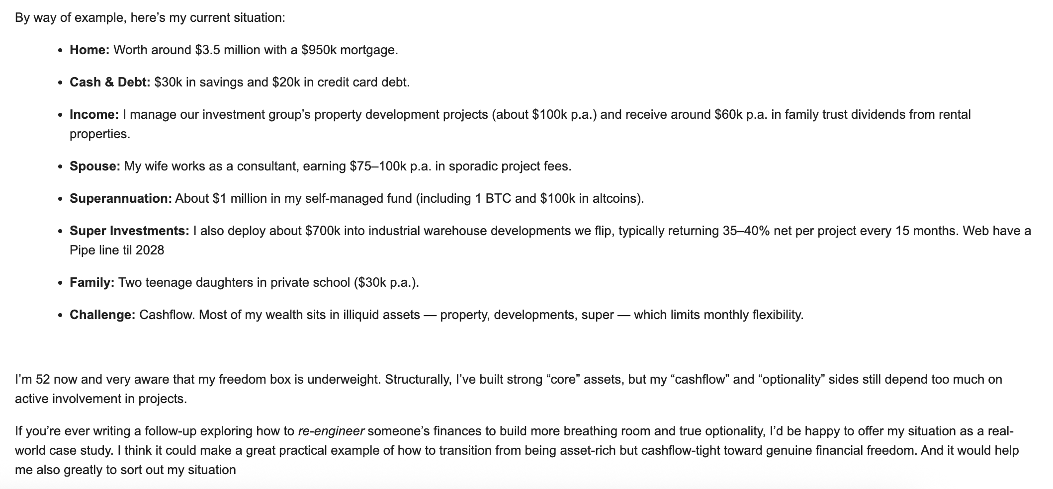 The reader is 52. Owns a $3.5 million home with a $950k mortgage. Manages property developments with solid returns, has $1 million in super, and two daughters in private school. In short, a life well-built. A strong core.