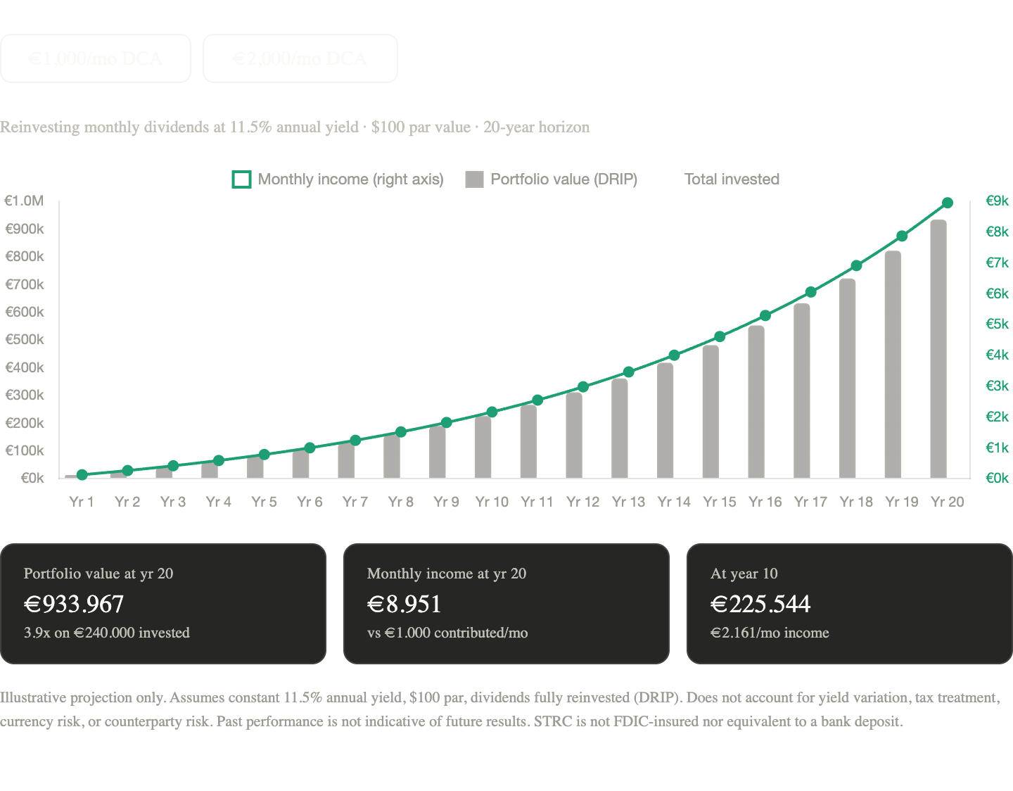 If you DCA €1,000 per month into STRC and reinvest every dividend which you can do automatically through any major broker here’s what the math produces at current yield levels. Toggle between €1,000 and €2,000 per month in the model above.