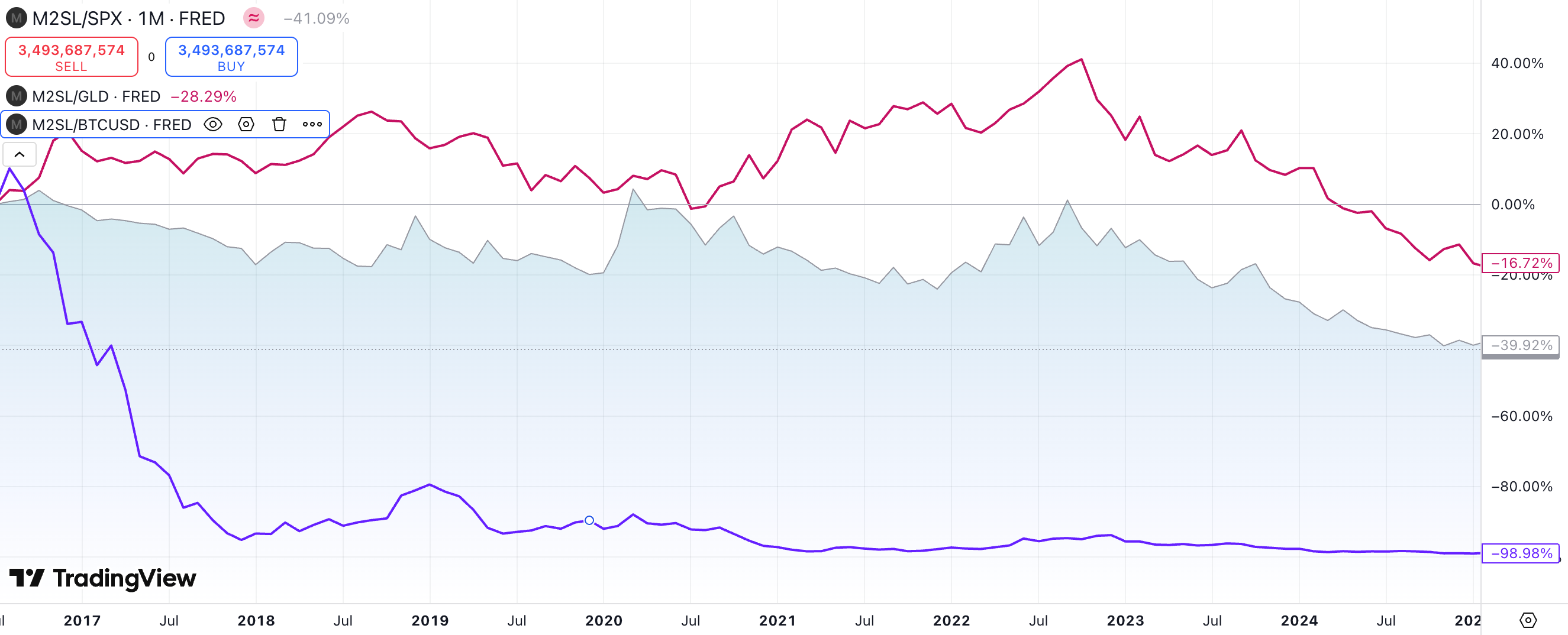 Gold has stayed flat, SPX has dropped a little bit. But Bitcoin has dropped 98% relative to M2. What does that mean? That its real purchasing power, measured against monetary supply, has exploded. It doesn’t just protect against inflation. It devours it.