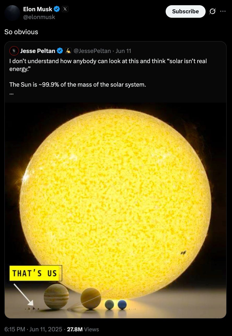 And for those still agnostic to this idea, I’ll be attaching an image Elon Musk once shared showing the size of the Sun relative to Earth. Just to remind us how much energy is truly out there… if we’re smart enough to harness it.
